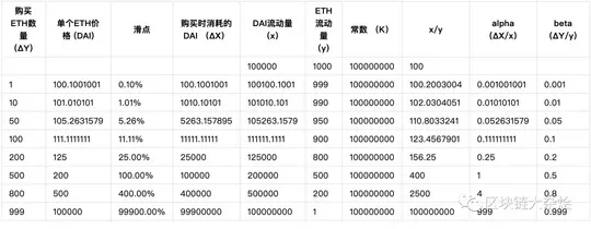 其中:表示流动性池中的 ETH 数量,表示流动性池中的 DAI 数量,表示流动性池中的价格