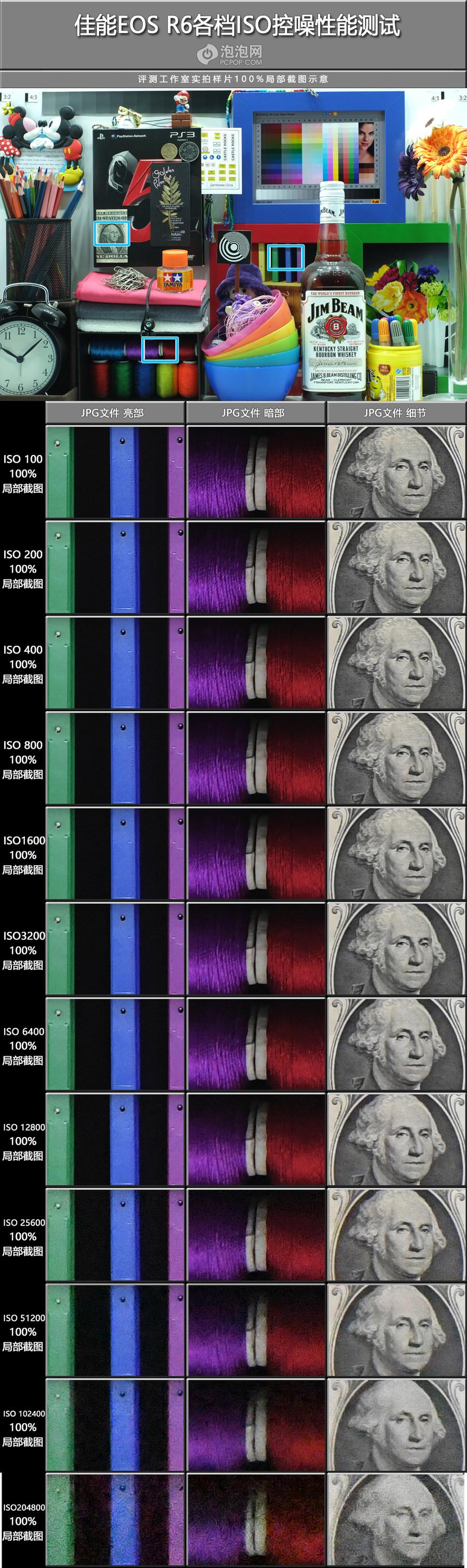 标准感光度下,佳能EOS R6在ISO 6400内表现良好,画面纯净细腻。不过在ISO 12800-25600感光度下,虽然画面有噪点,细节呈现下降趋势,但在标准降噪下,JPG直接输出的噪点控制能力和画质表现还是可以接受的;在标准感光度ISO最高值时,可以感觉到图像质量继续下降,但仍然没有明显的噪点,在一些极端环境下仍然具有一定的可用性。 EOS R6在扩展感光度ISO下有明显的画质损失,但实际上,如果使用这么高的ISO,意义不在于细节有多丰富,而在于在这个ISO下是否仍能区分被摄体,比如在室外弱光场景拍摄野生动物时,能够清晰地捕捉到它们更为重要,所以至少对于EOS R6来说,ISO并不是完全不可用。