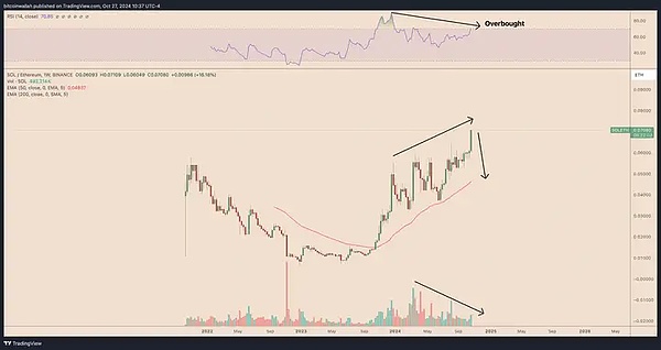 SOL/ETH 货币对的看跌背离,加上 RSI 和成交量下降,表明买盘压力正在减弱,价格可能会回调。从历史上看,超买状况经常导致 SOL/ETH 货币对跌向 50 周均线,这表明潜在的下跌幅度约为 35%。