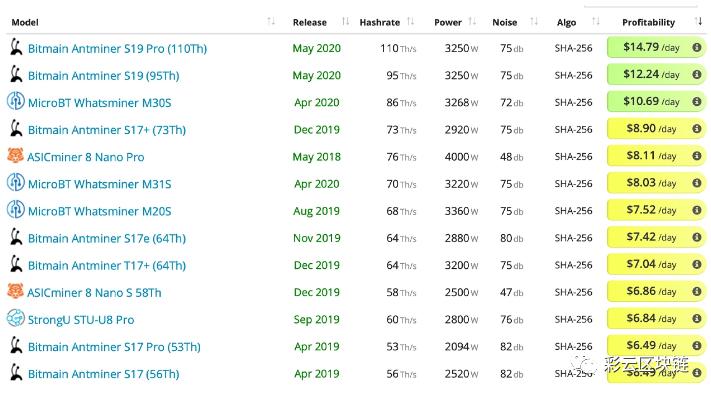 如果能效比在53-110W/TH之间,电价0.36元,那么有很多新一代矿机以今天的币价仍然可以盈利。其中包括 S19 Pro (110 TH/s)、 S19 (95 TH/s)、 M30S (86 TH/s)、 S17 (73 TH/s) 和 矿机 M31S (70 TH/s)。所有这些采矿设备每天的收入在 6 至 15 美元之间,具体取决于机器每秒输出的计算能力。