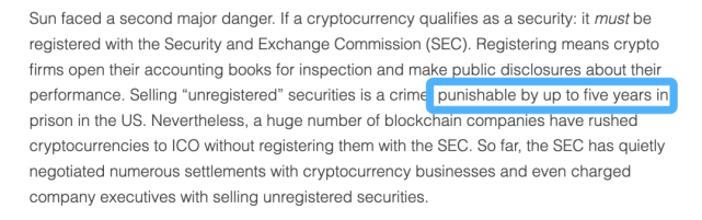 看上去很吓人,但实际上,孙老师一点也不着急。毕竟,加密货币是否是一种证券,在美国法律界还没有定论,就像食品安全法不能用来制裁露天小便一样。