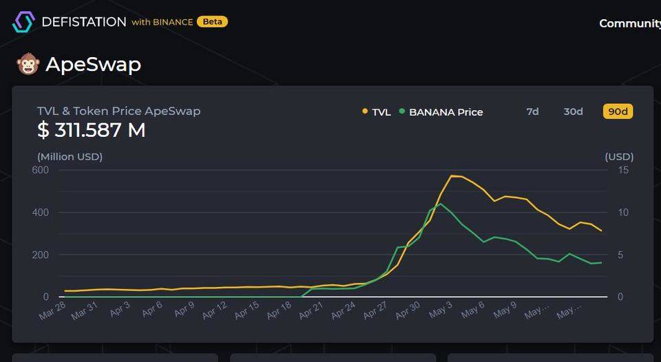 进入5月后,BSC头部项目表现疲软。 BSC最大机枪池的锁仓量从5月4日76亿美元的高点跌至如今的40亿美元。 BSC最大借贷平台Venus的锁仓量从5月10日的150亿美元下降至87亿美元。美元。