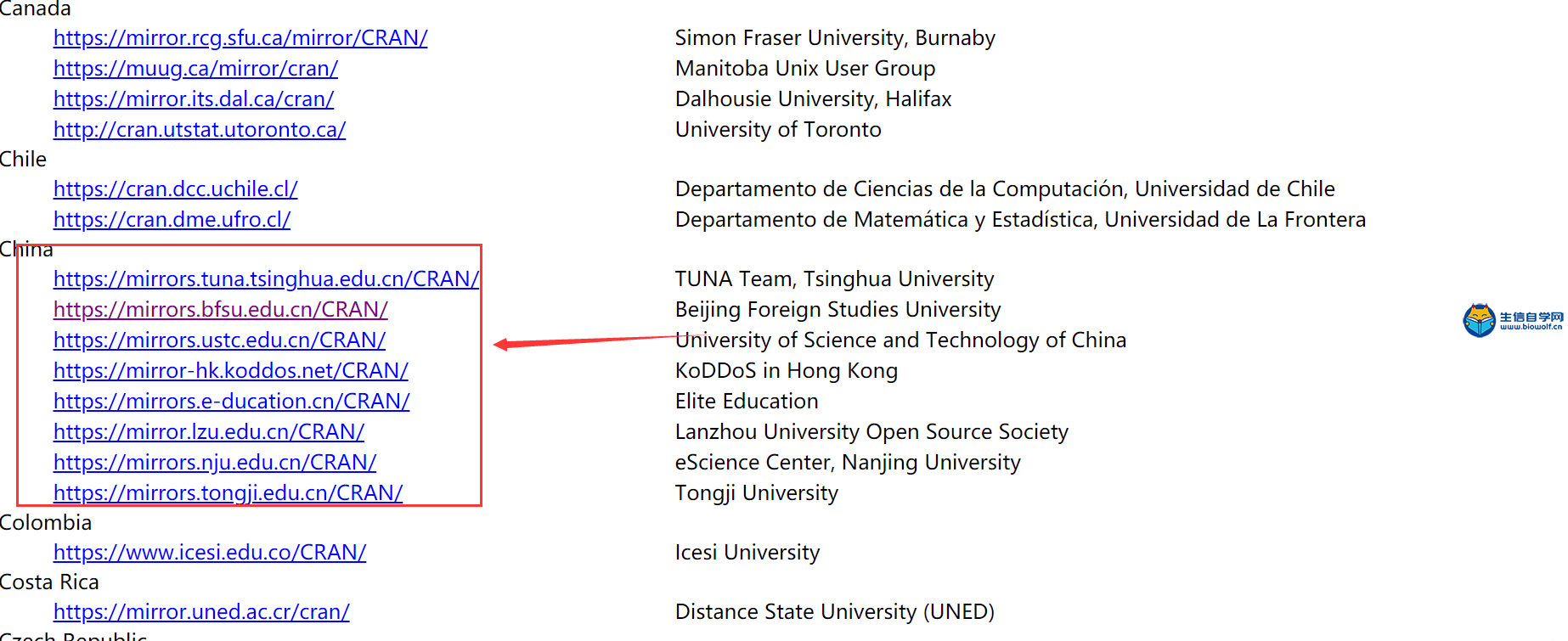 接下来我们安装R。我们同样在浏览器中搜索R,进入主页,进入下载页面,选择要下载的镜像和操作系统。安装过程中的路径也不能有汉字和空格。