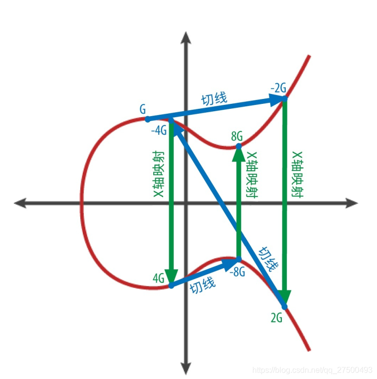 通过这条椭圆曲线就可以生成公钥。以随机生成的私钥 k 为起点,与曲线上定义的生成点 G 相乘,得到曲线上的另一个点,然后得到对应的公钥 K 。生成点是标准的一部分。比特币密钥的生成点是相同的:{K = k * G},其中k是私钥,G是生成点,得到的曲线上的点K是公钥。