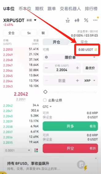 我们通常使用基于U的标准并将USDT用于定价。回到U标准,我们可以看到我们可用的USDT是0。这意味着,在进行合同交易之前,我们的U-标准帐户需要拥有USDT。如果没有,我们需要先将一些资金转移到U-帐户。我们单击0USDT后面的双箭头。