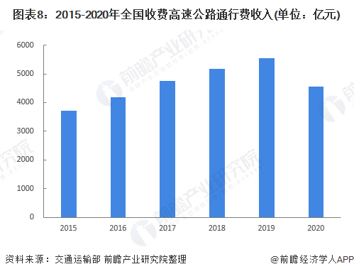 2015年至2019年,随着高速公路车流量不断增长,全国通行费也随之上涨。受春节假期小型客车免费通行政策两次延长的影响,2020年全国收费公路车辆通行费总收入4868.2亿元,较2019年净减少1069.7亿元。